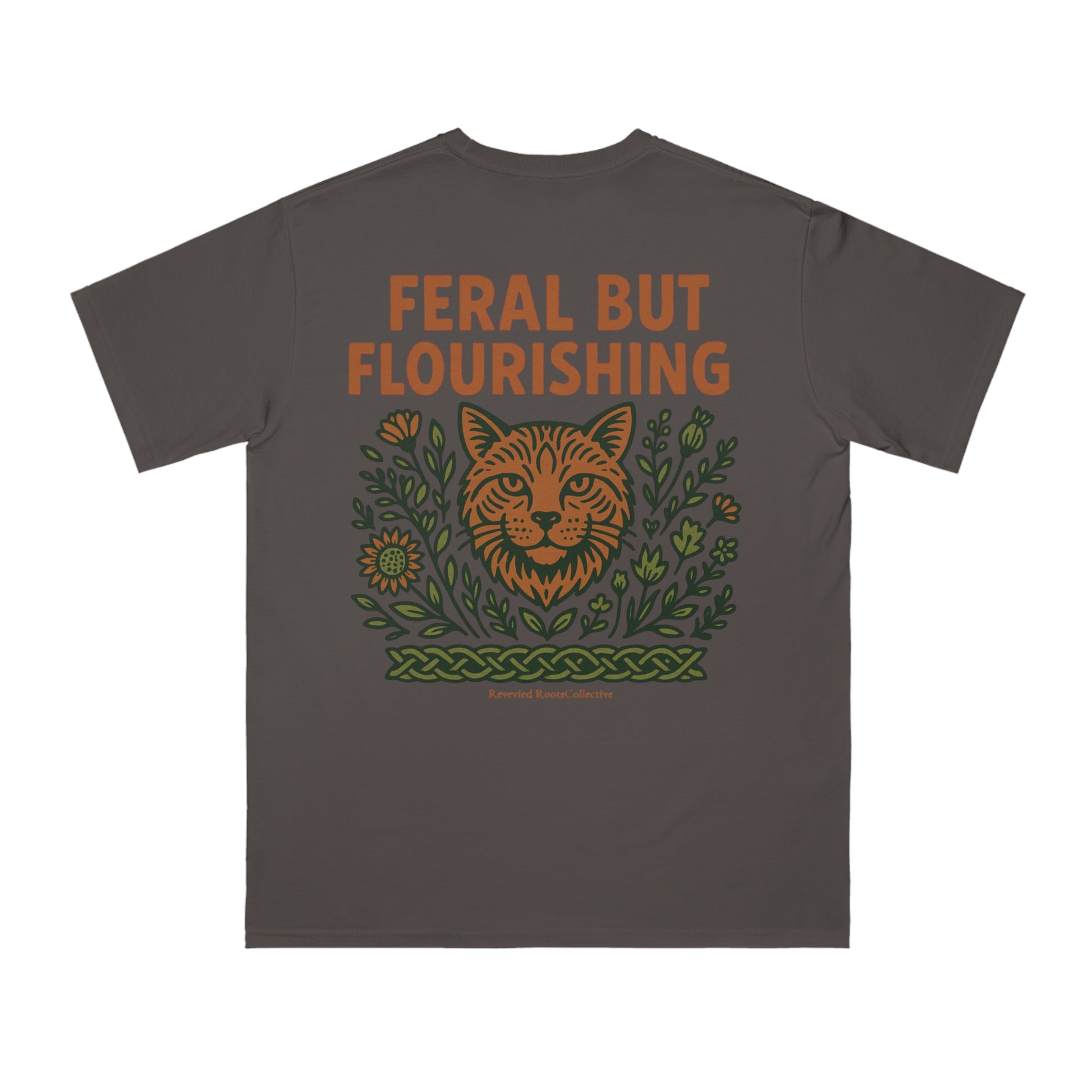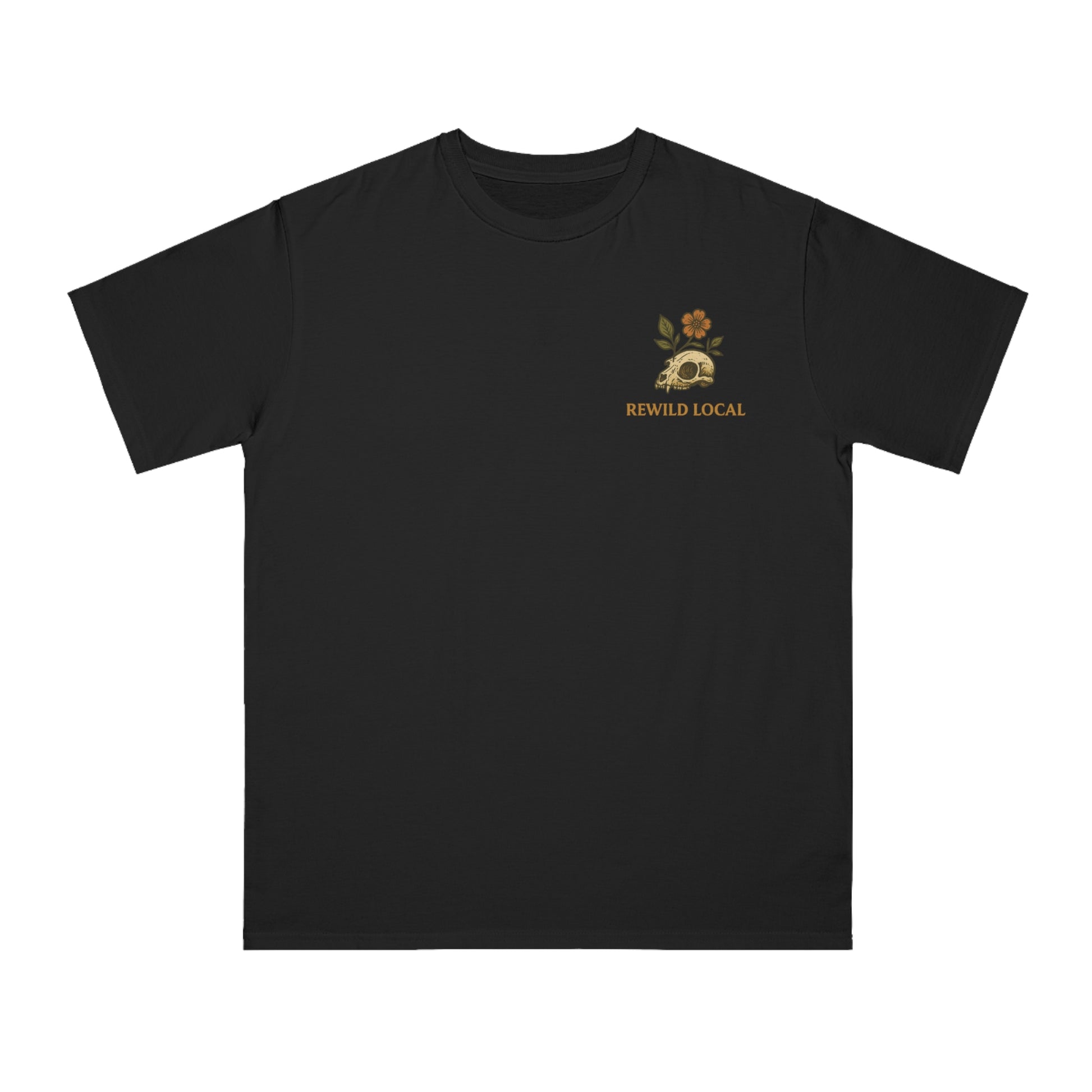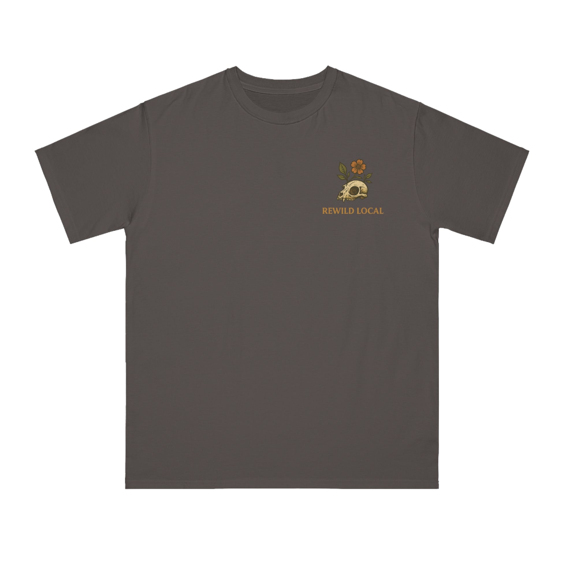 This organic unisex classic T-shirt features a mini “Rewild Local” skull/flower graphic on the front and a full “Feral But Flourishing” detailed illustration on the back. With an eco-conscious, folk art-inspired design quality, this T-shirt gives off a rustic and bohemian vibe perfect for nature lovers and eco-conscious individuals. It is relevant for Earth Day, Arbor Day, and every day wear for those who appreciate sustainable fashion.